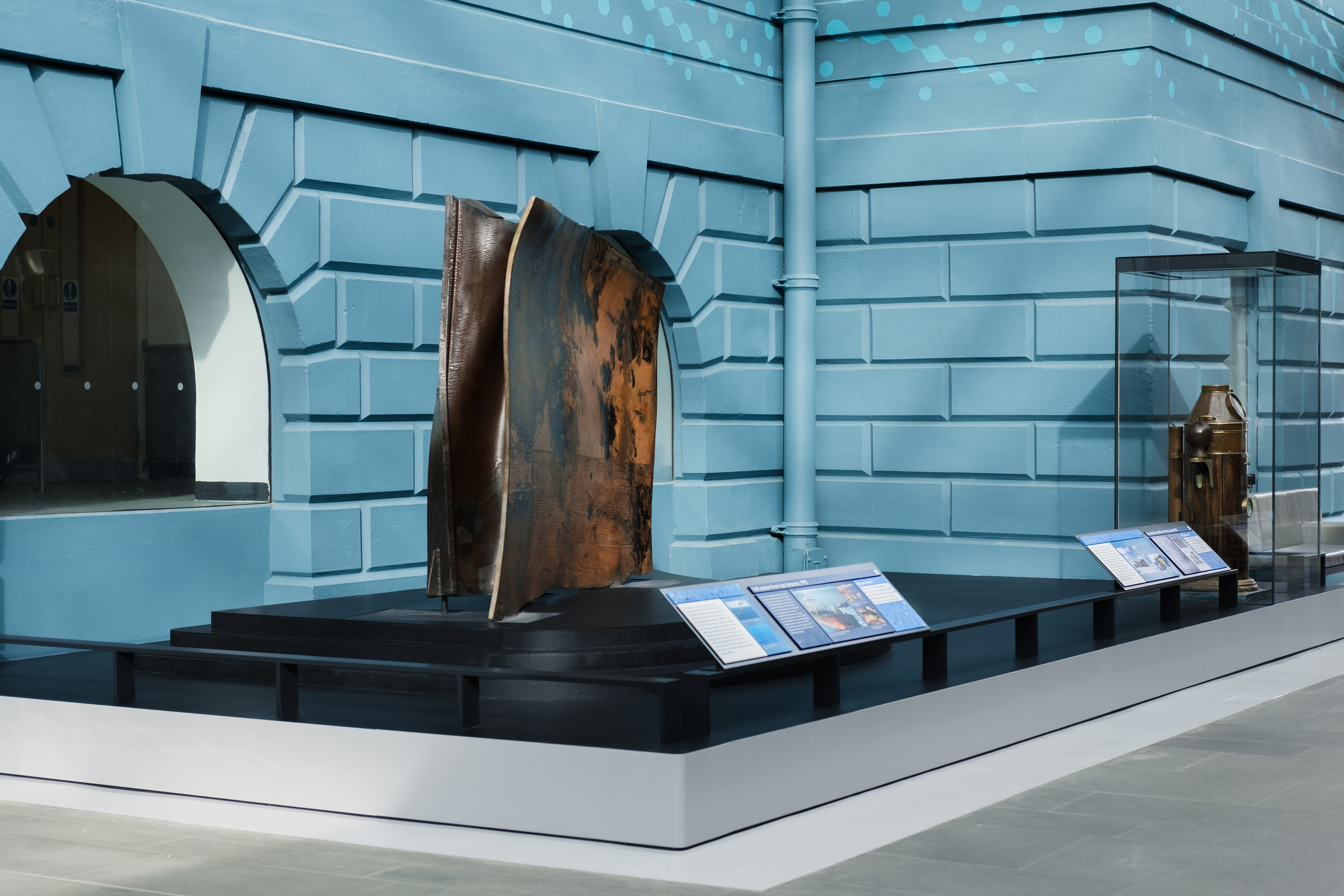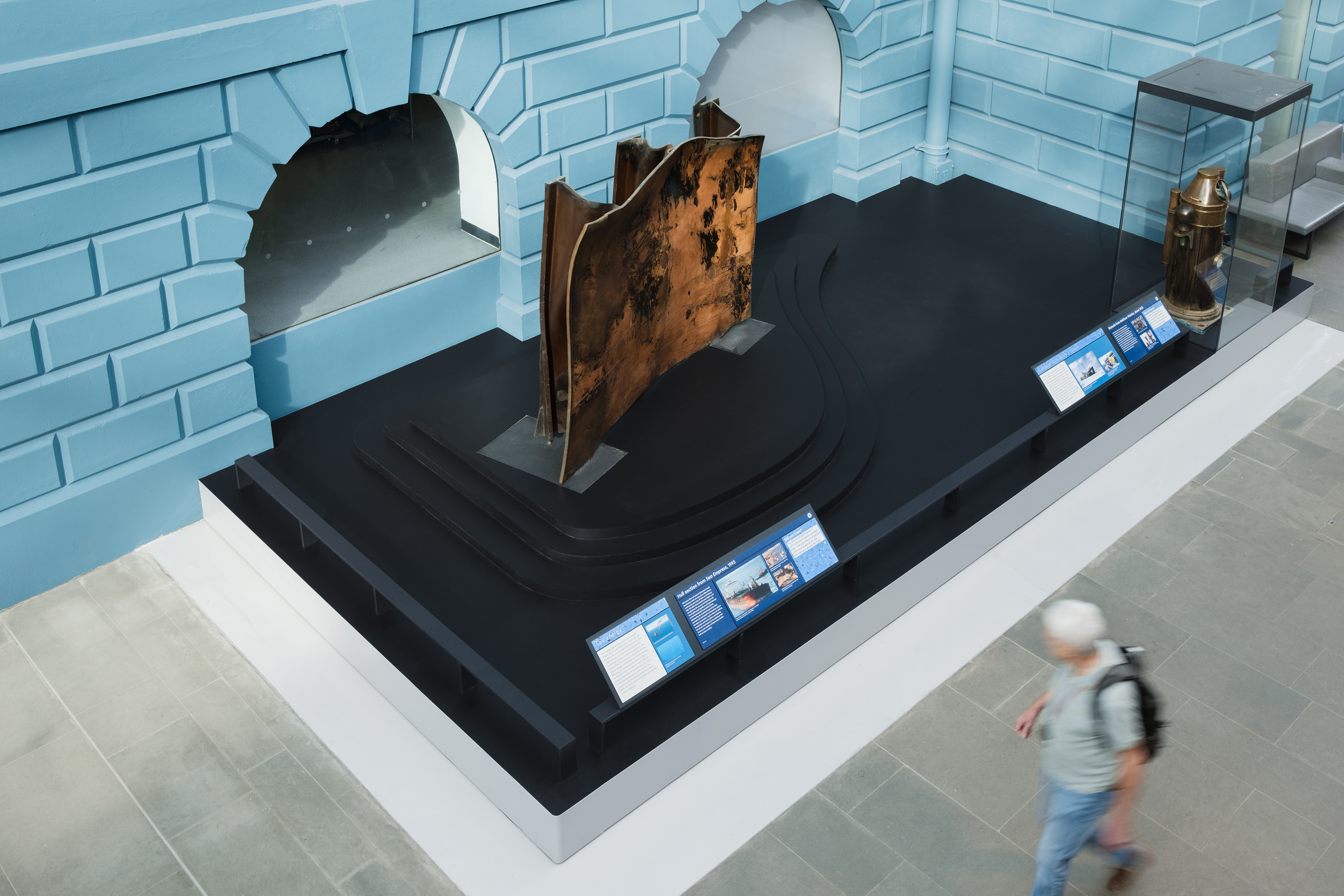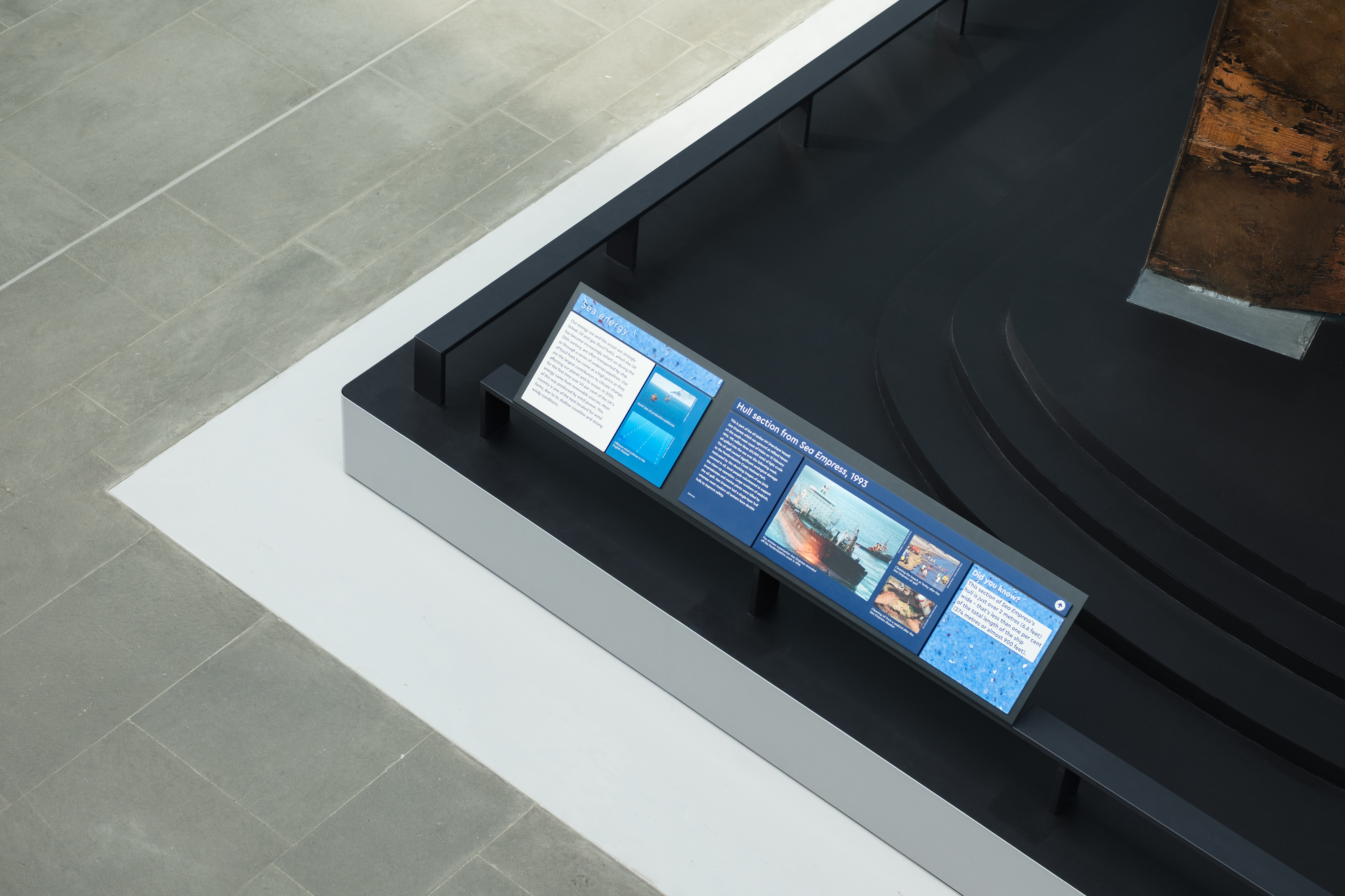 This permanent display brings together two powerful maritime stories: the 1996 Sea Empress oil spill off the coast of Wales and the 1985 bombing of Greenpeace’s Rainbow Warrior. The design frames these striking objects - a section of the Sea Empress’s hull and the binnacle from the Rainbow Warrior - within a narrative of environmental impact and activism.